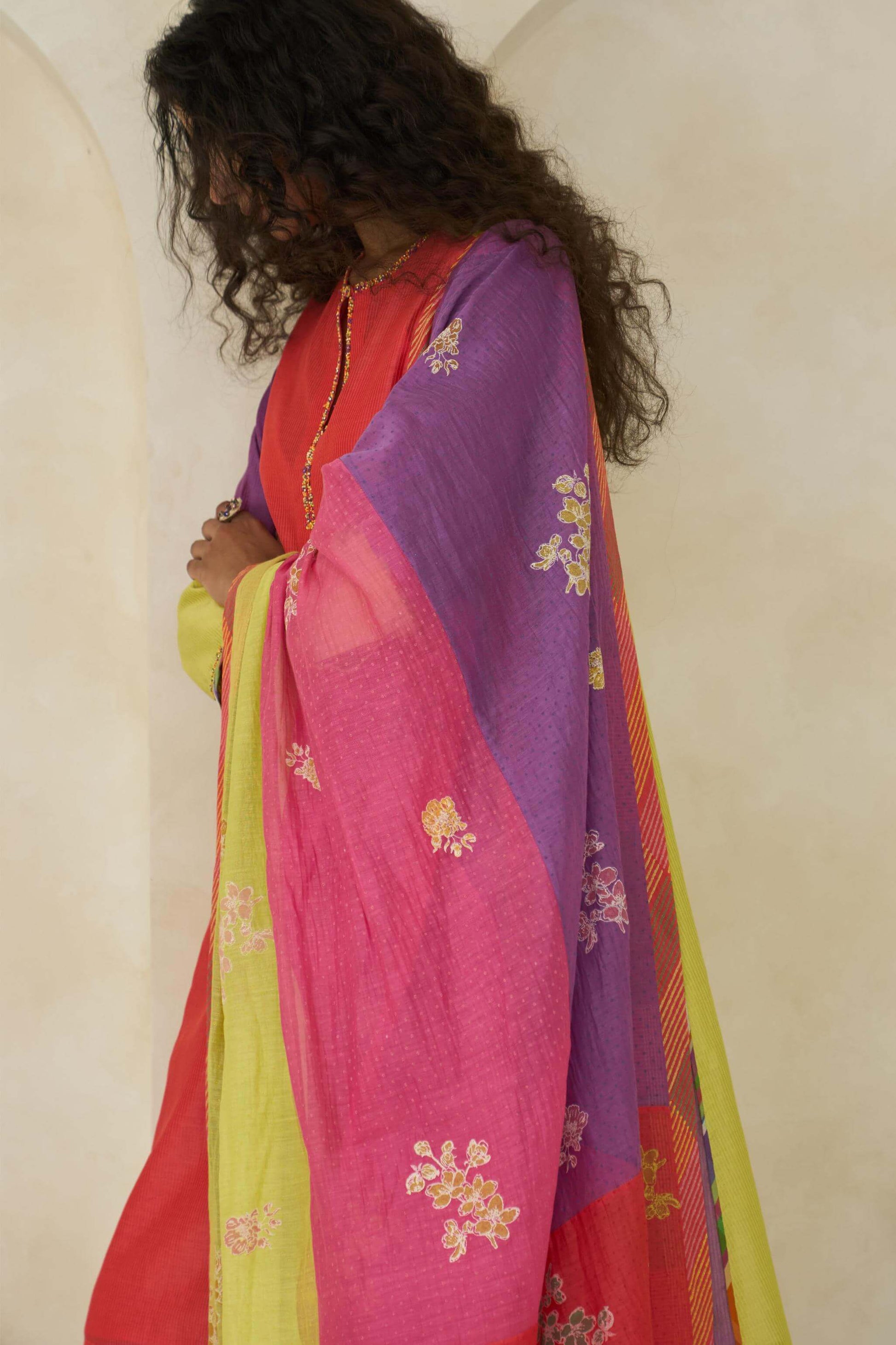 Hand block–printed dupatta in handwoven 40 gm Chanderi, finished with beaded fringing and scrap-fabric tassels.
