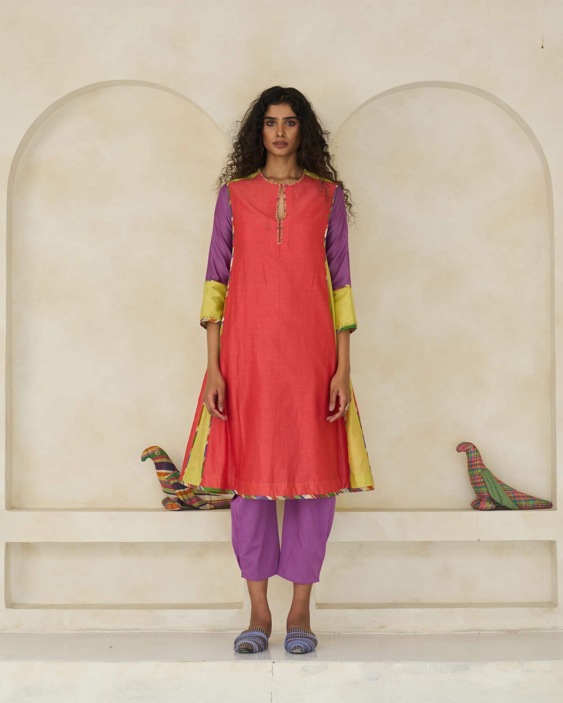 Kurta in striped self Chanderi with thin piping, hand embroidery on the neckline and cuffs, and delicate hand-beaded details.