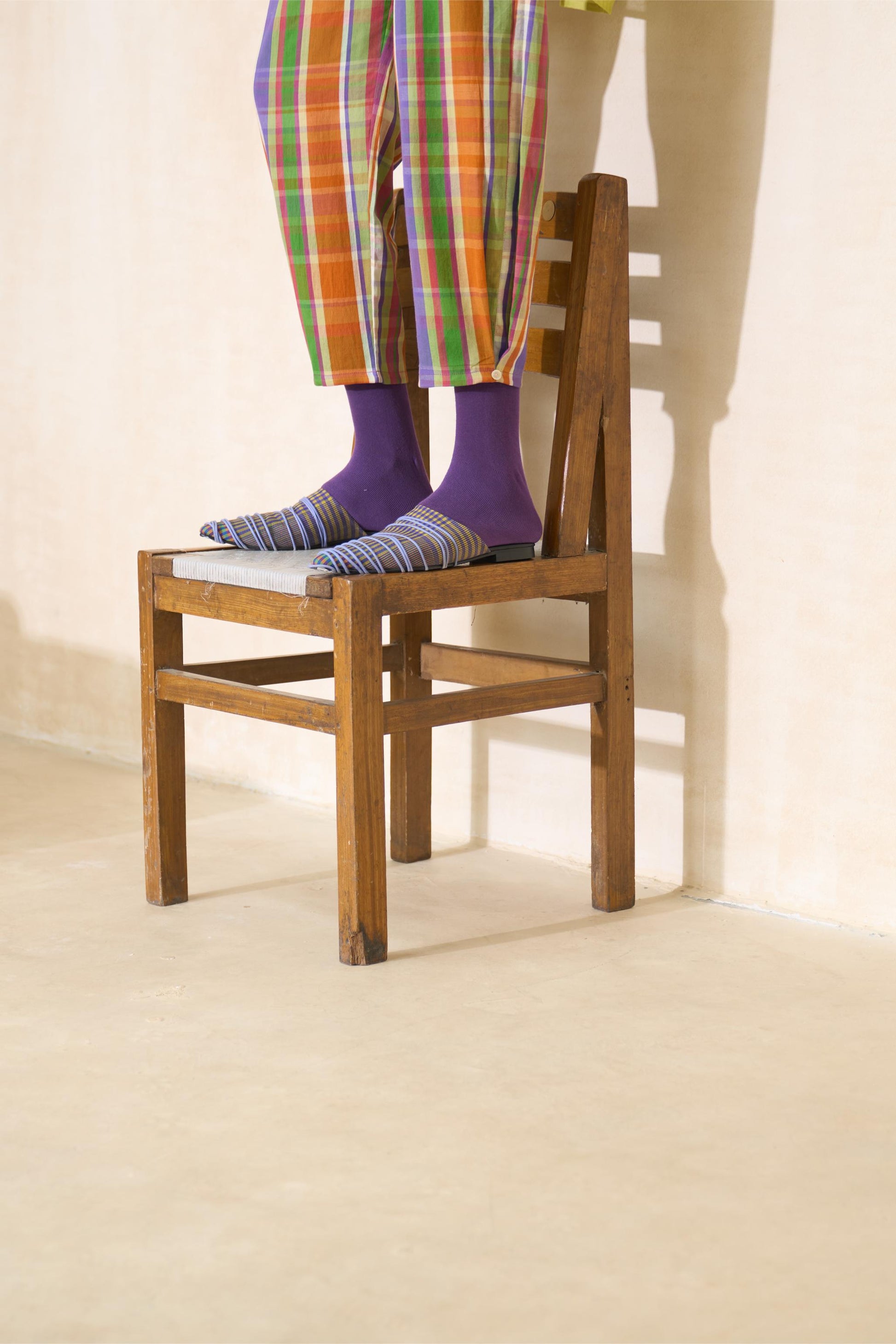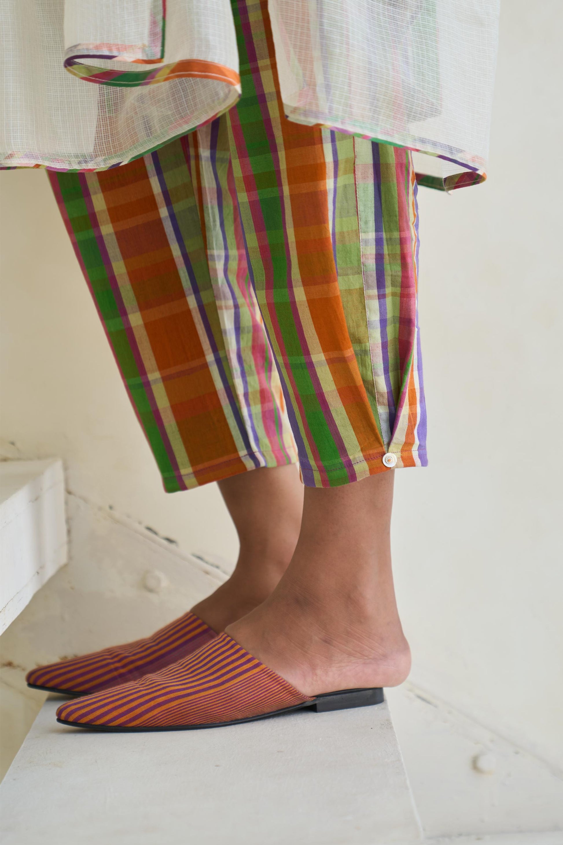 Pants with an inverted pleat and hand embroidery at the hem. Handwoven, yarn-dyed Bengal 100% cotton Playful Pop Multi thick irregular check multicolor.