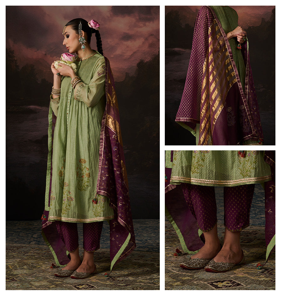 Handwoven 40gm Chanderi Kurta featuring Fine Pintucks, Textured Detailing, and Hand Block Printing, Enhanced with Hand Embroidery and Gota Lines. Comes with a 100% Cotton Slip.
