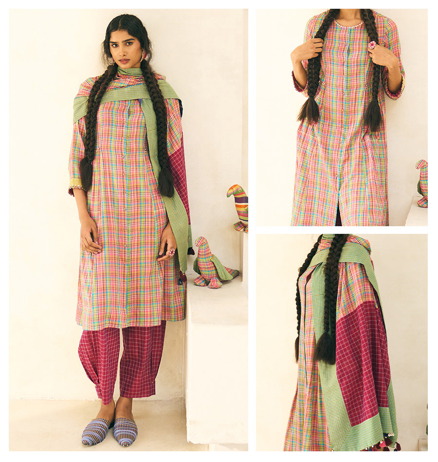 Kurta with a front button opening, enhanced with hand-done beadwork, crafted in handwoven yarn-dyed 100% Bengal cotton irregular punch pink check.