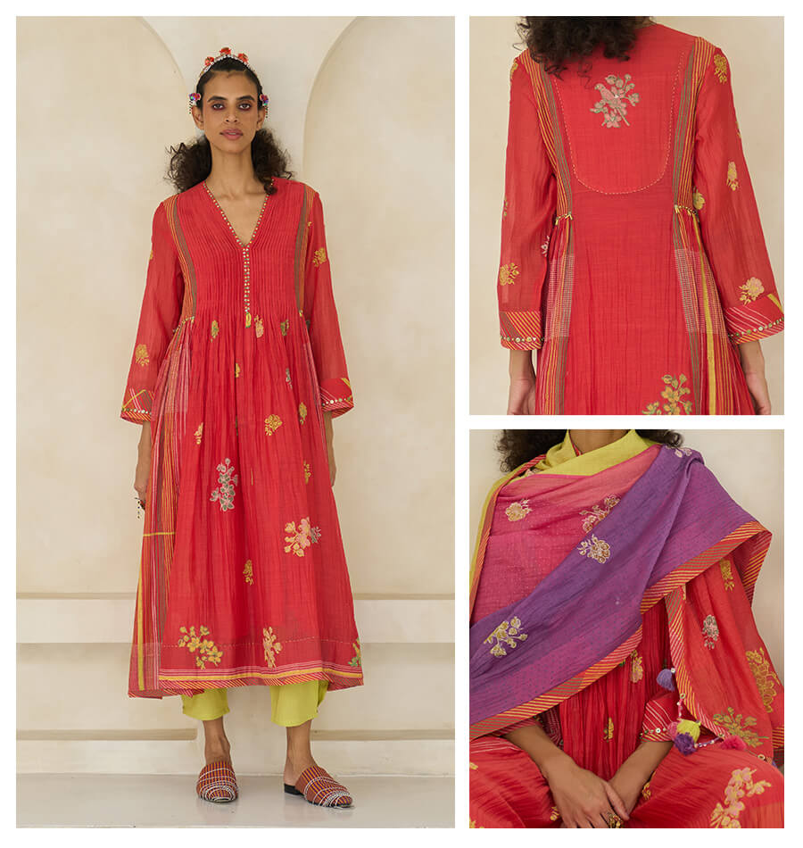 Pintucked Kurta in handwoven 40 gm Chanderi, embellished with hand block printing and hand-worked beading. Comes with a 100% cotton slip.