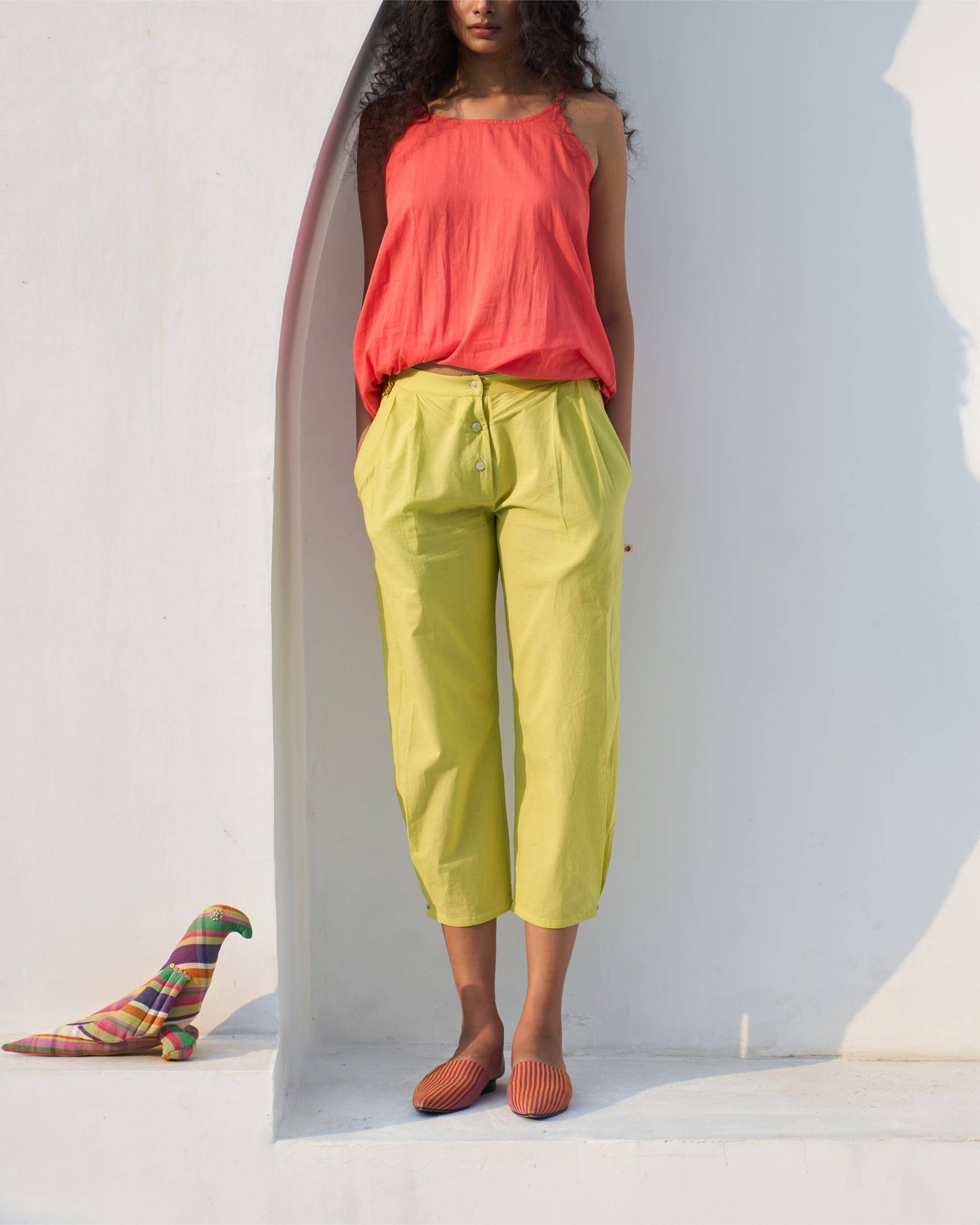 Pant with an inverted pleat and hand embroidery at the hem, in 100% cotton cambric.