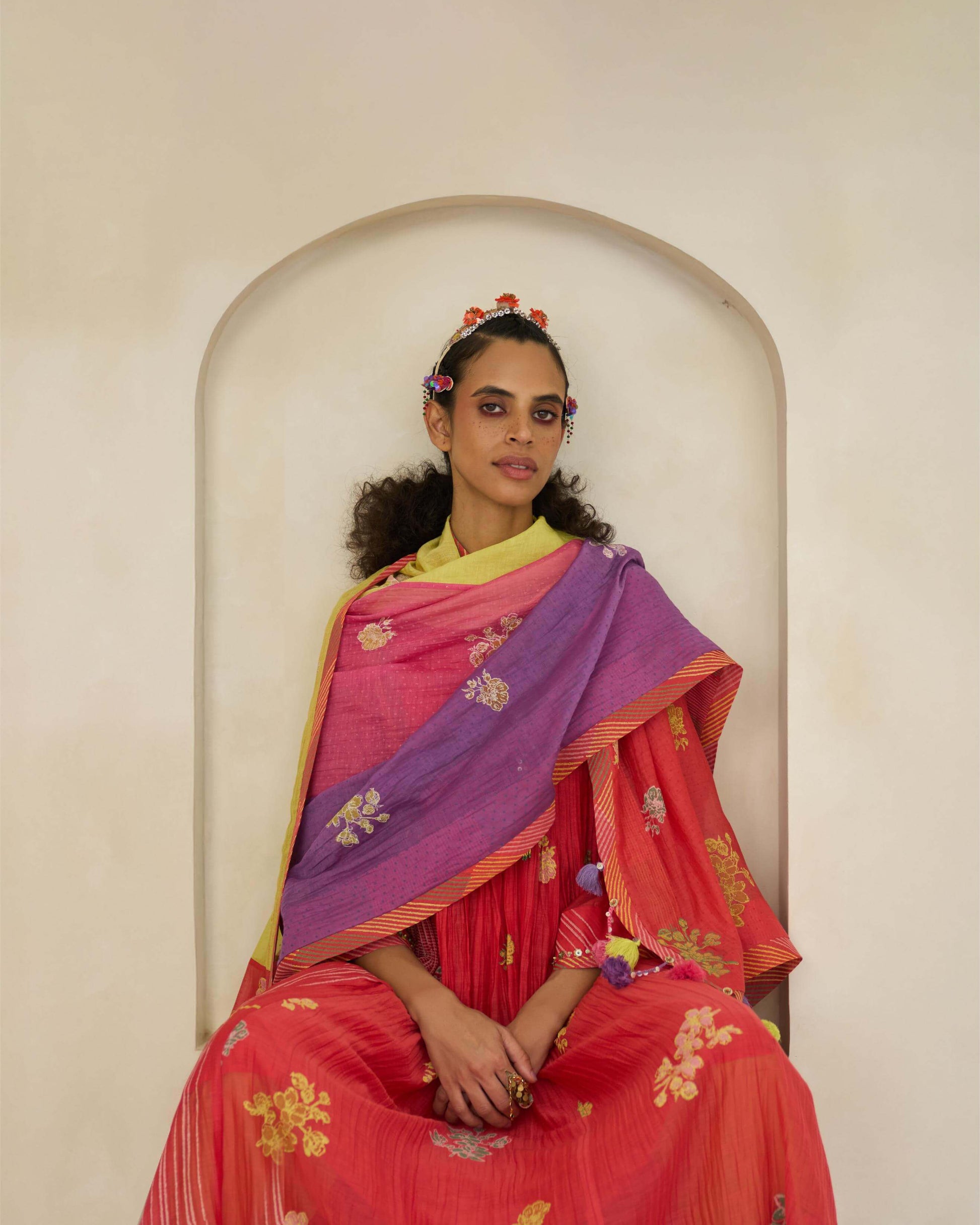Hand block–printed dupatta in handwoven 40 gm Chanderi, finished with beaded fringing and scrap-fabric tassels.