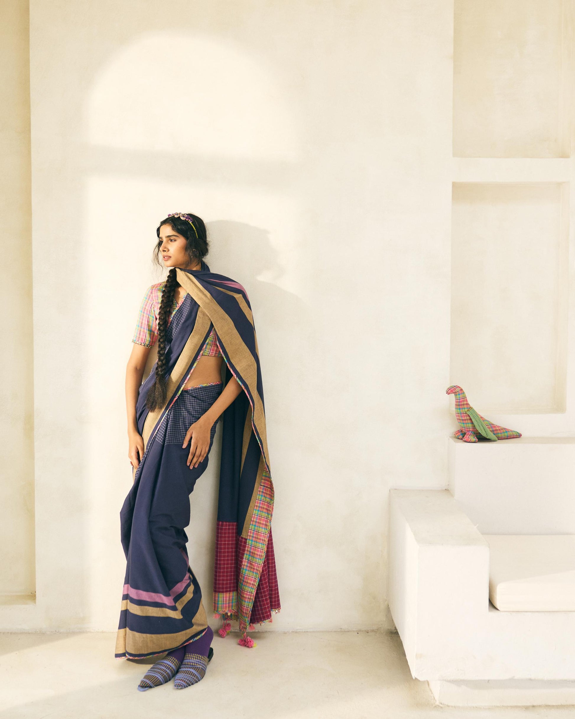 - Handwoven yarn-dyed Bengal 100% cotton sari in twilight blue with a garnet maroon check palla and a punch-pink check thin border.