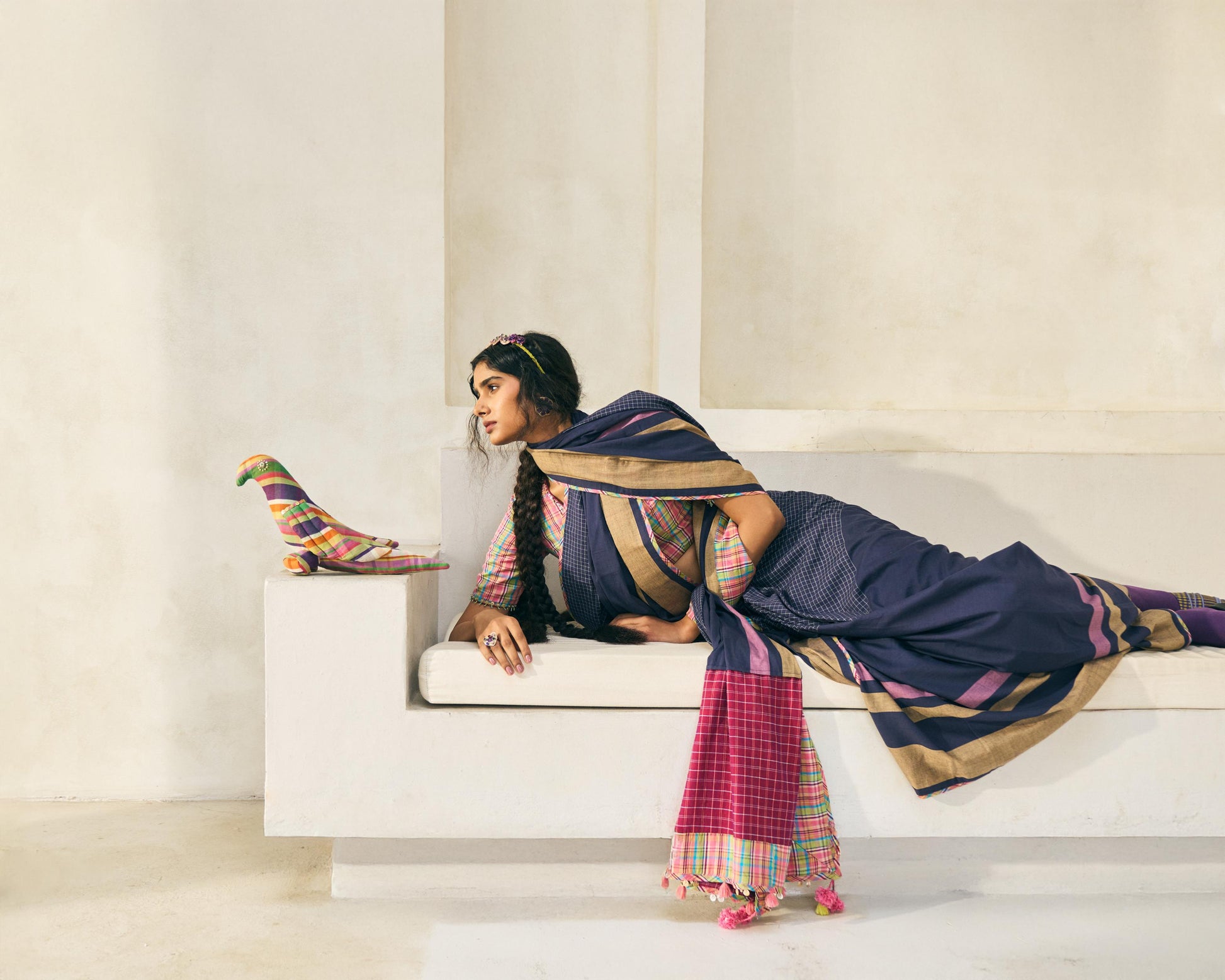 Sari with a garnet maroon check palla, punch-pink check thin border, hand-done beadwork, and tassel detail, crafted in handwoven yarn-dyed Bengal 100% cotton in twilight blue.
