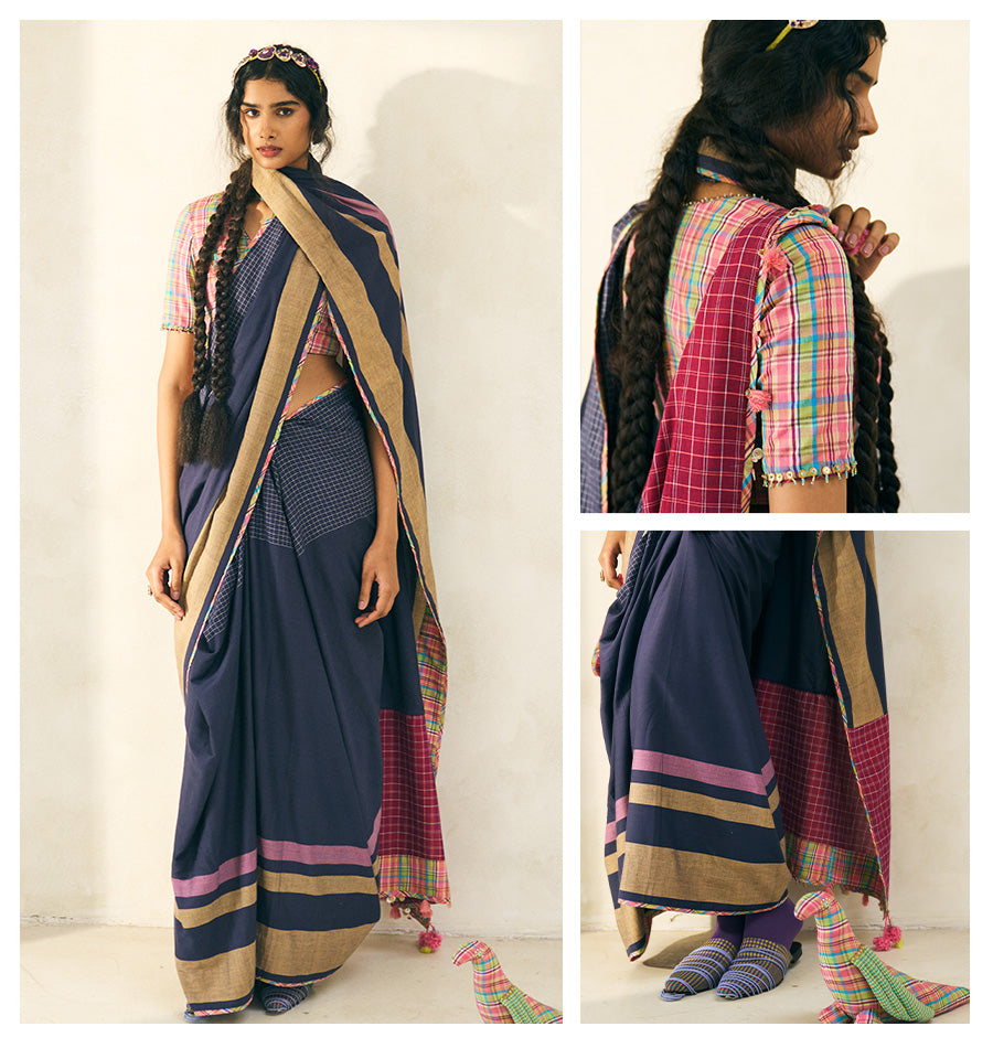 Sari with a garnet maroon check palla, punch-pink check thin border, hand-done beadwork, and tassel detail, crafted in handwoven yarn-dyed Bengal 100% cotton in twilight blue.