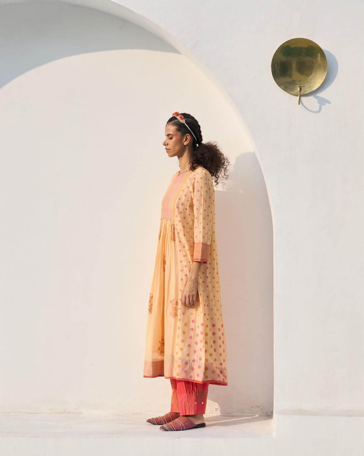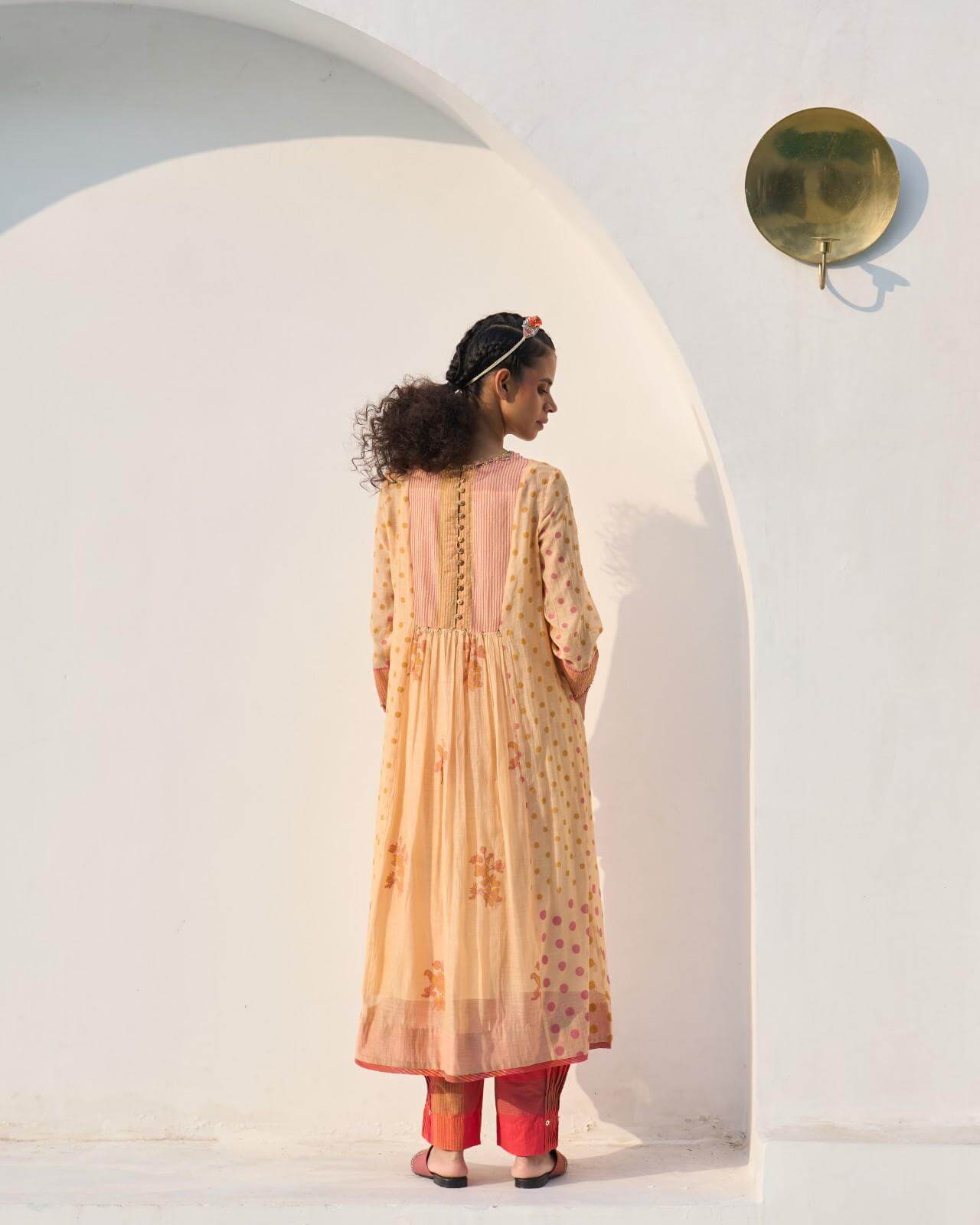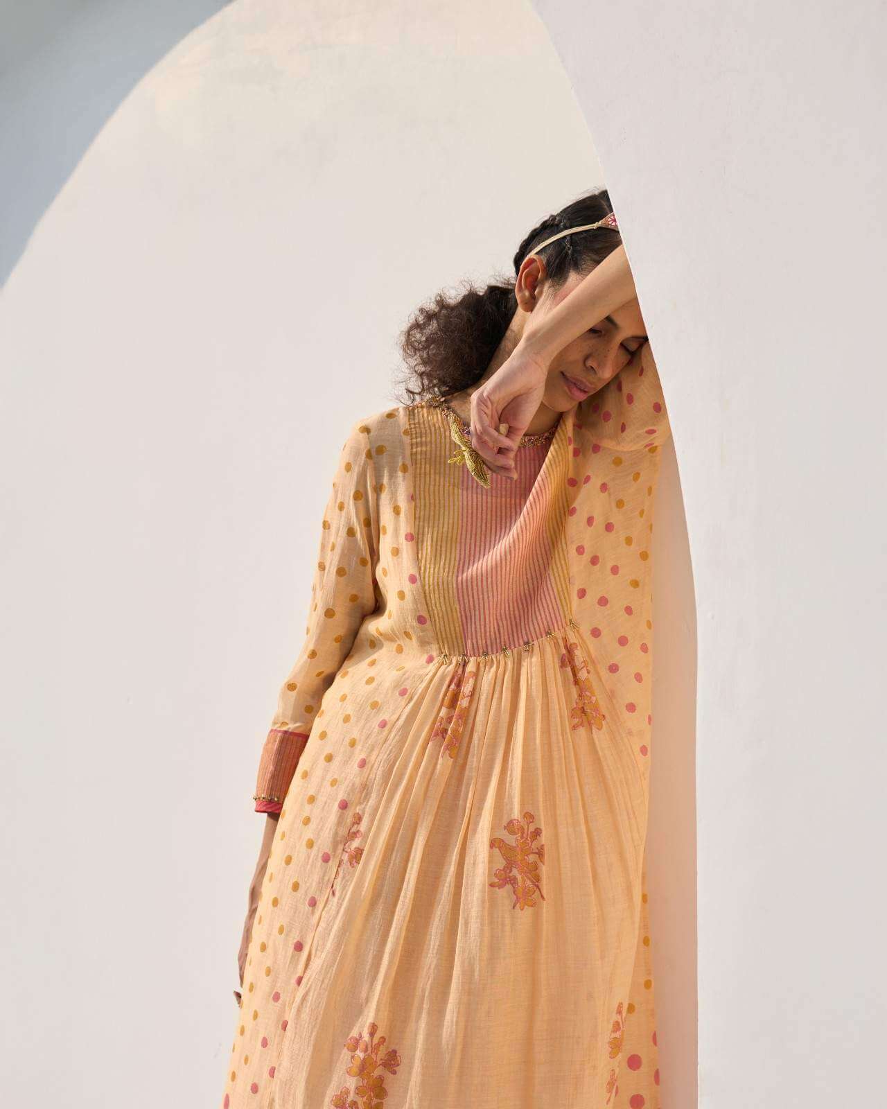 Hand block-printed and handwoven 40 gm Chanderi dress with gathers at the front and back, embellished with beadwork fringe and an embroidered neckline. Comes with a 100% cotton slip.