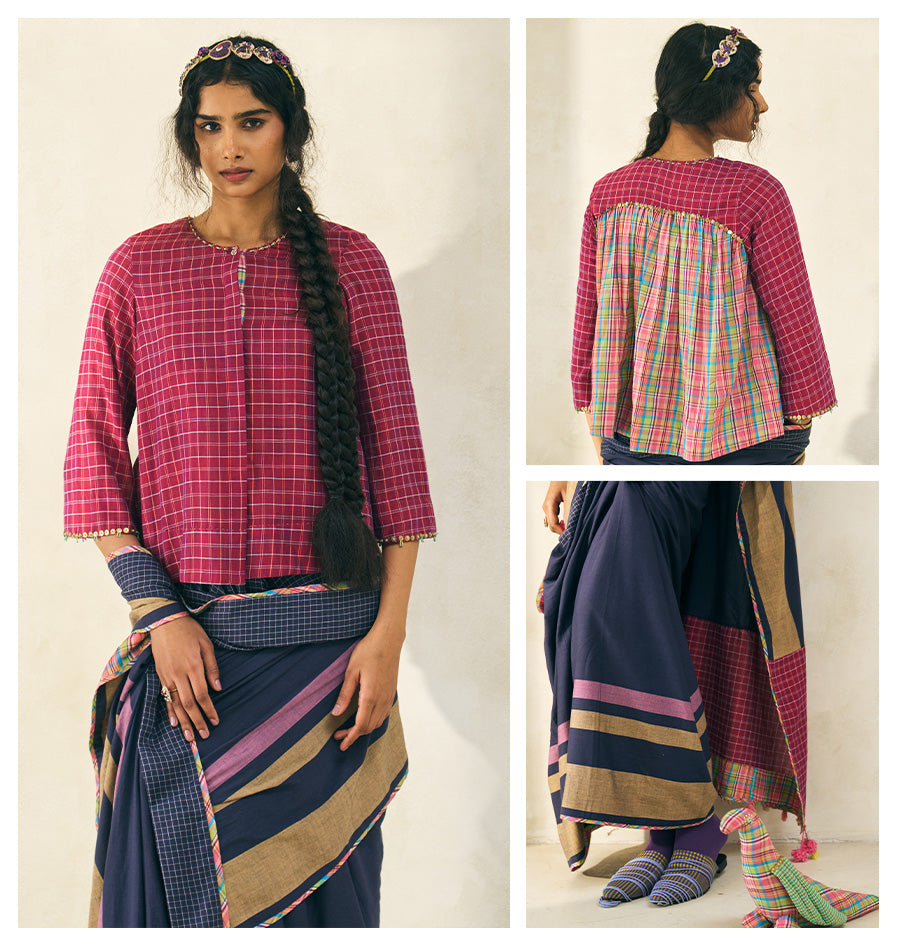 - Handwoven yarn-dyed Bengal 100% cotton top in garnet maroon checks with irregular punch-pink checks.