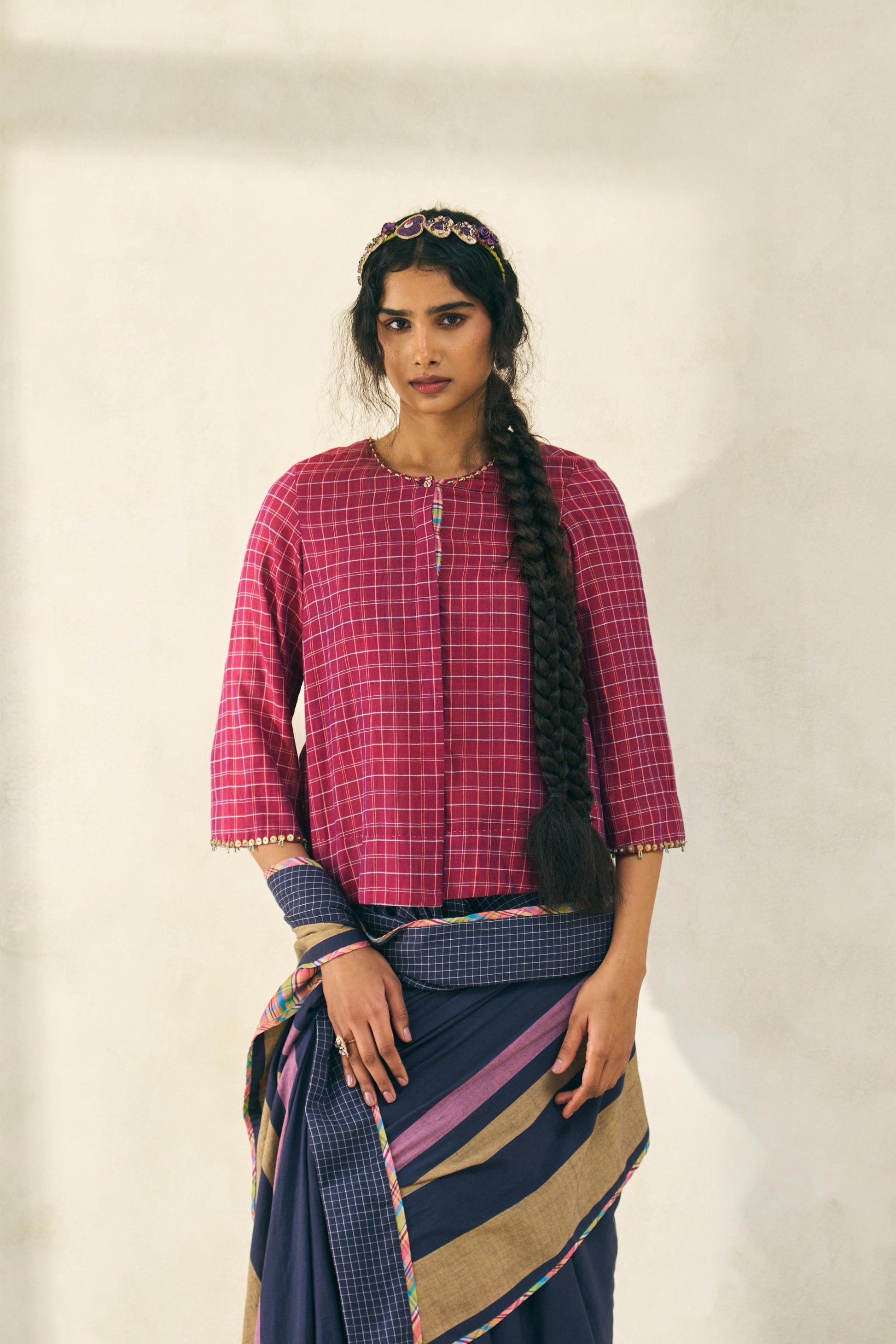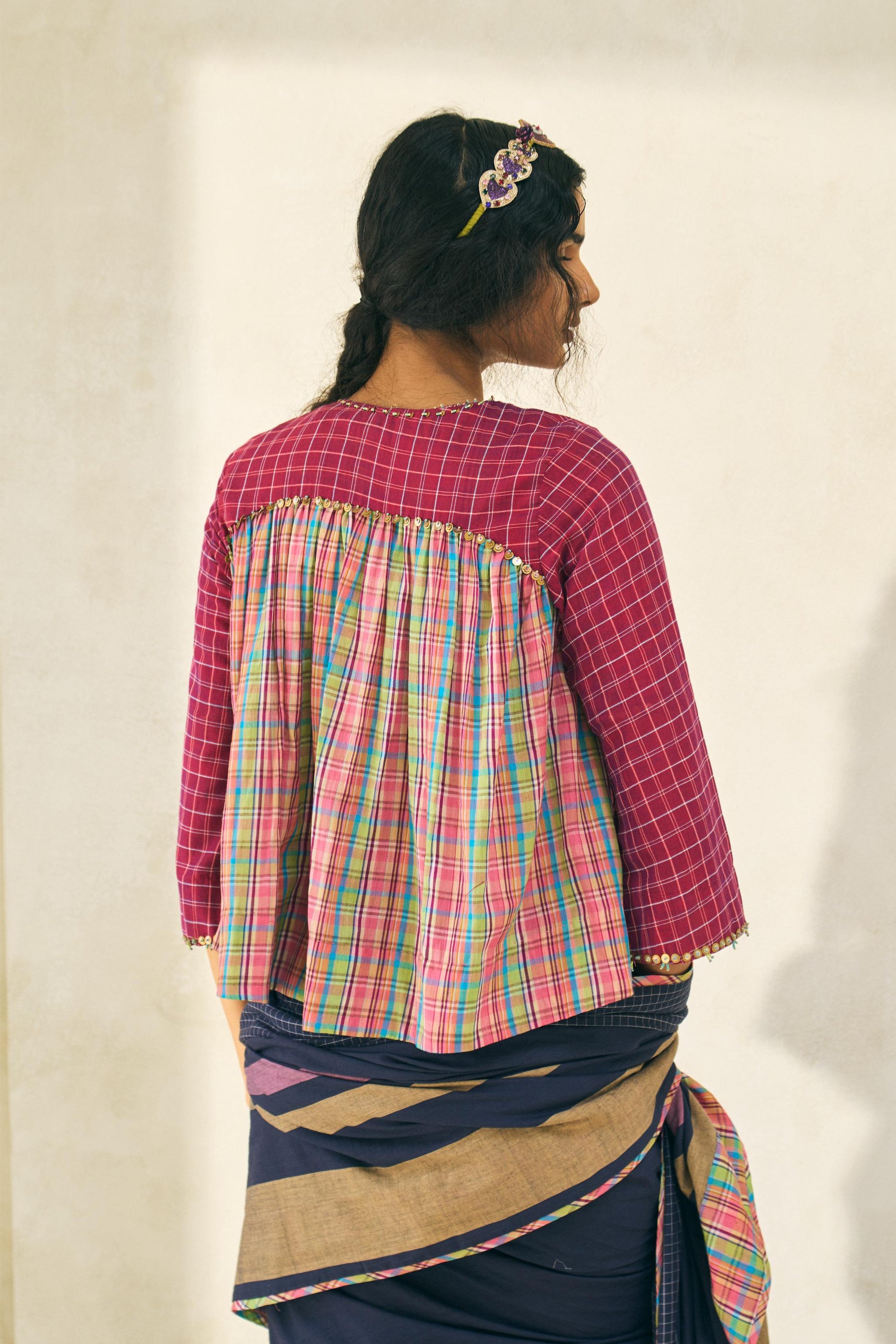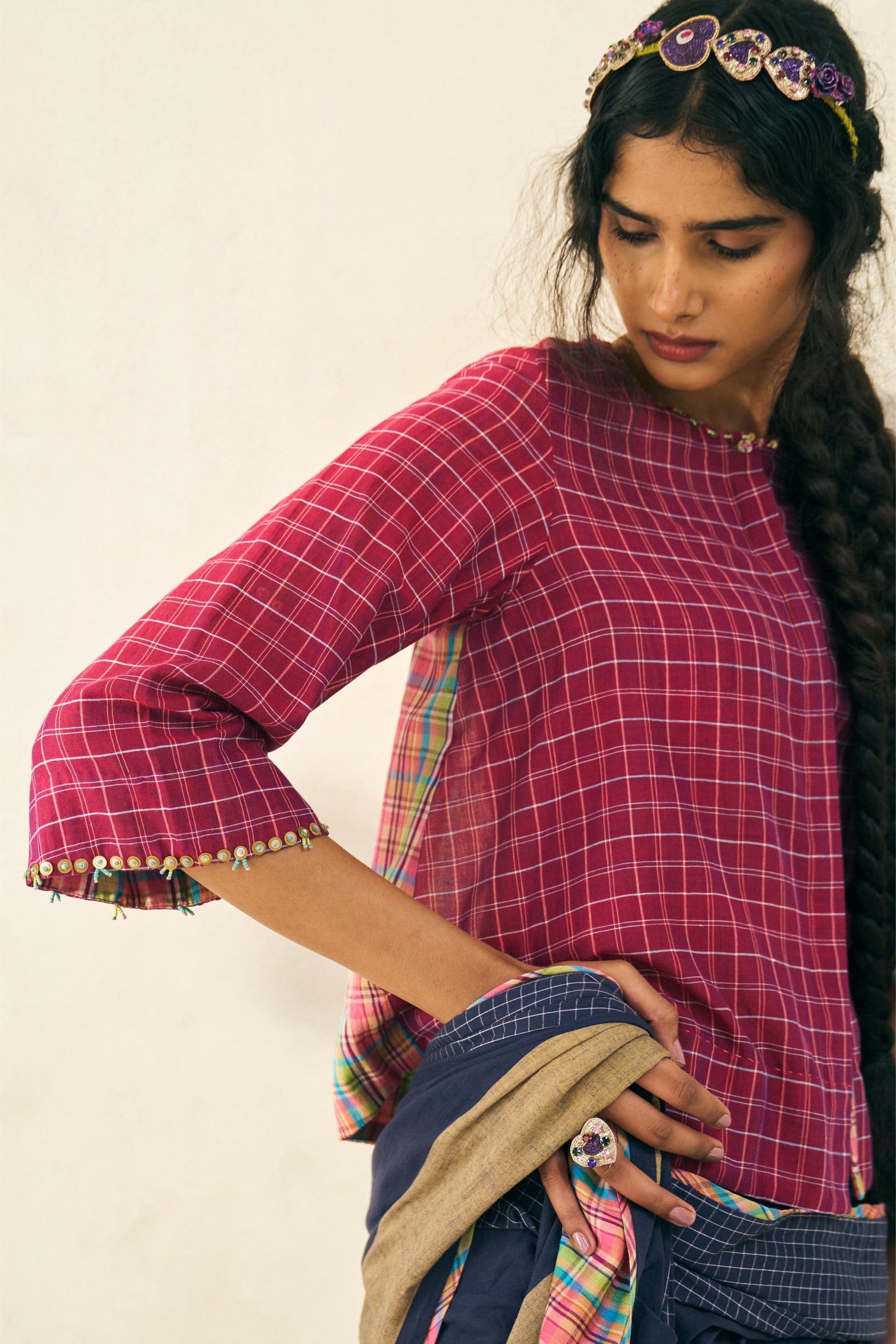 - Handwoven yarn-dyed Bengal 100% cotton top in garnet maroon checks with irregular punch-pink checks.