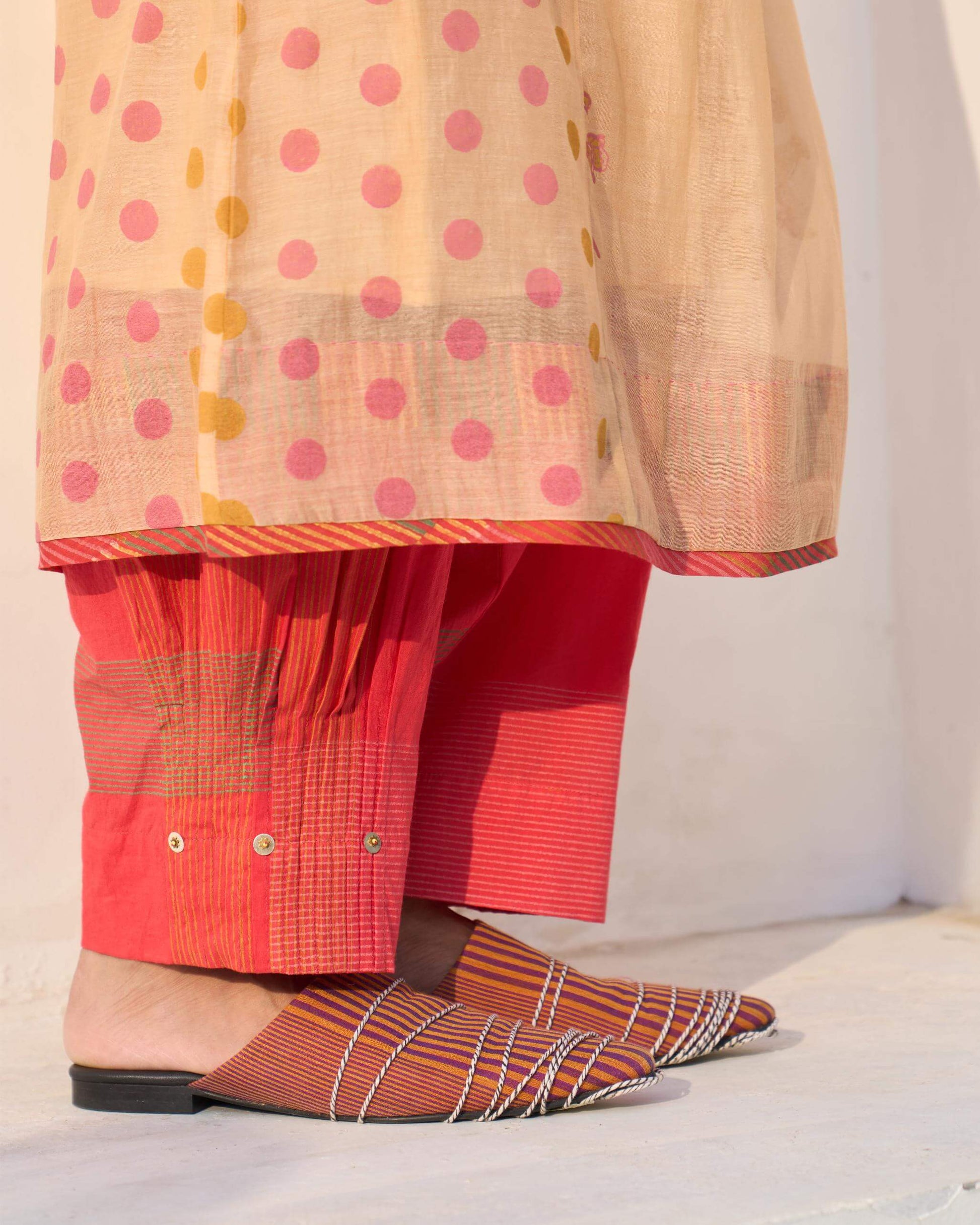 Hand block-printed cambric pants in 100% cotton with side bottom pintucks, adorned with hand embroidery at the hem.