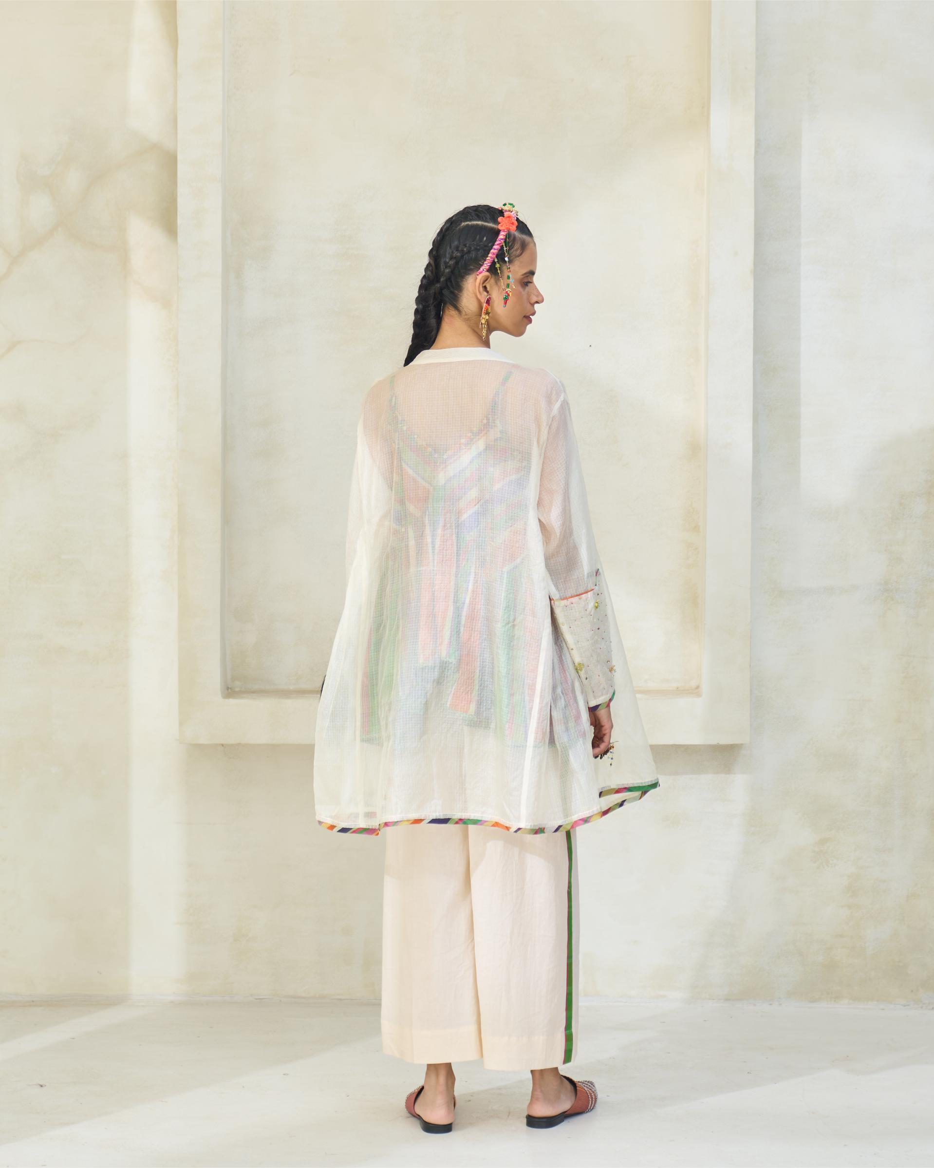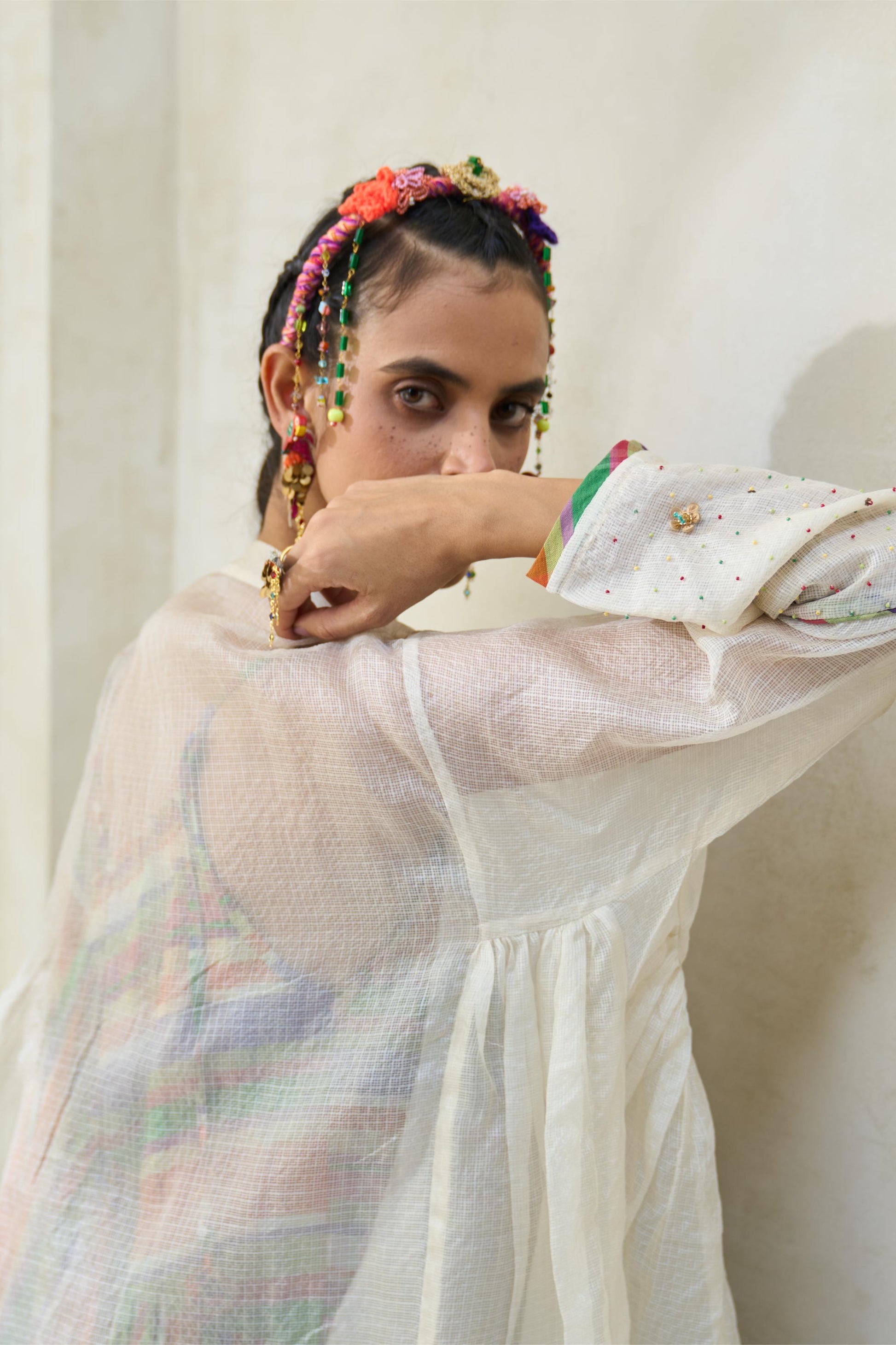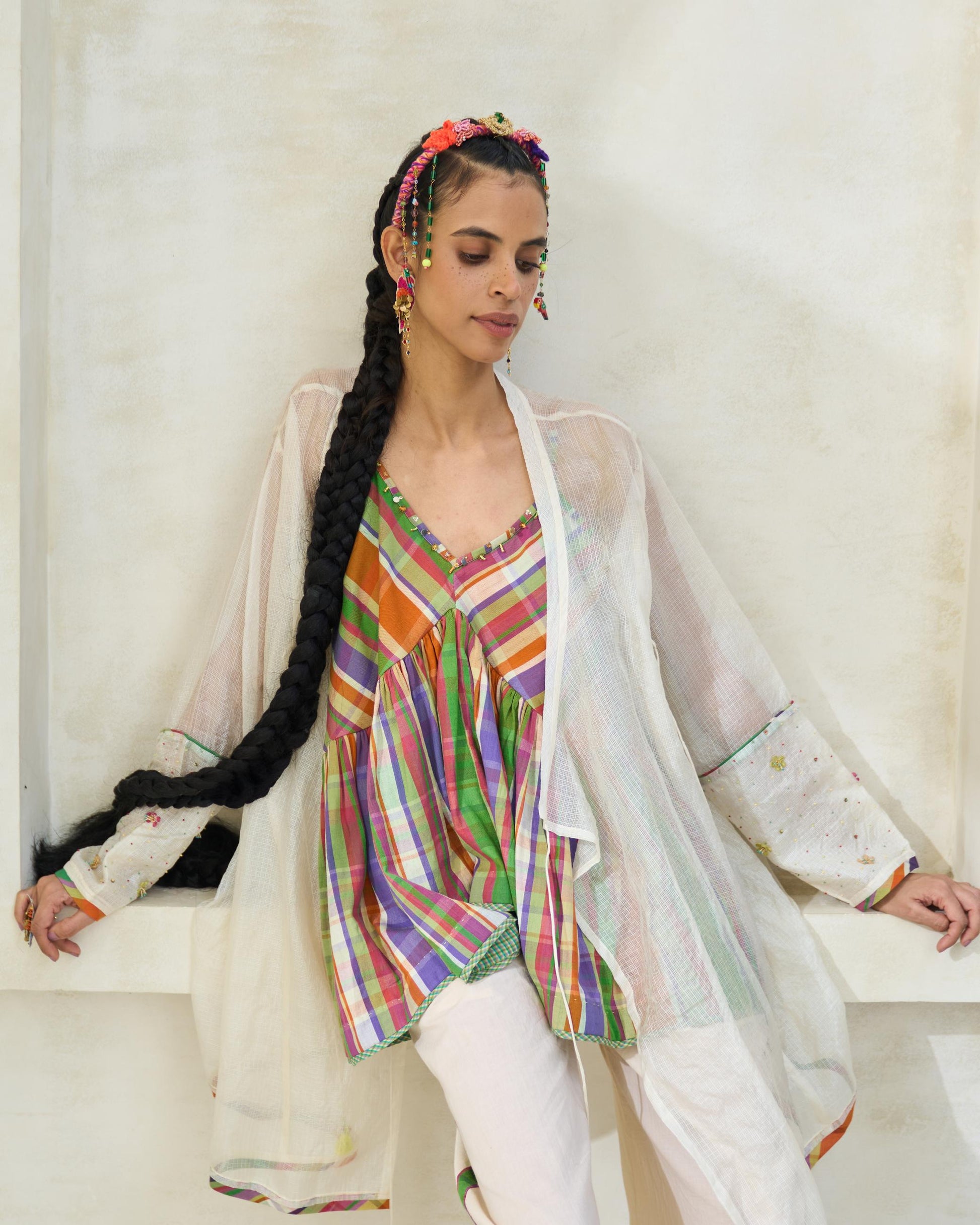 Oversized wrap overlay in handwoven Kota silk, with yarn-dyed Bengal cotton in irregular multicolor check detailing. Finished with multicolor check piping, hand-embroidered cuffs, and tassel detailing.