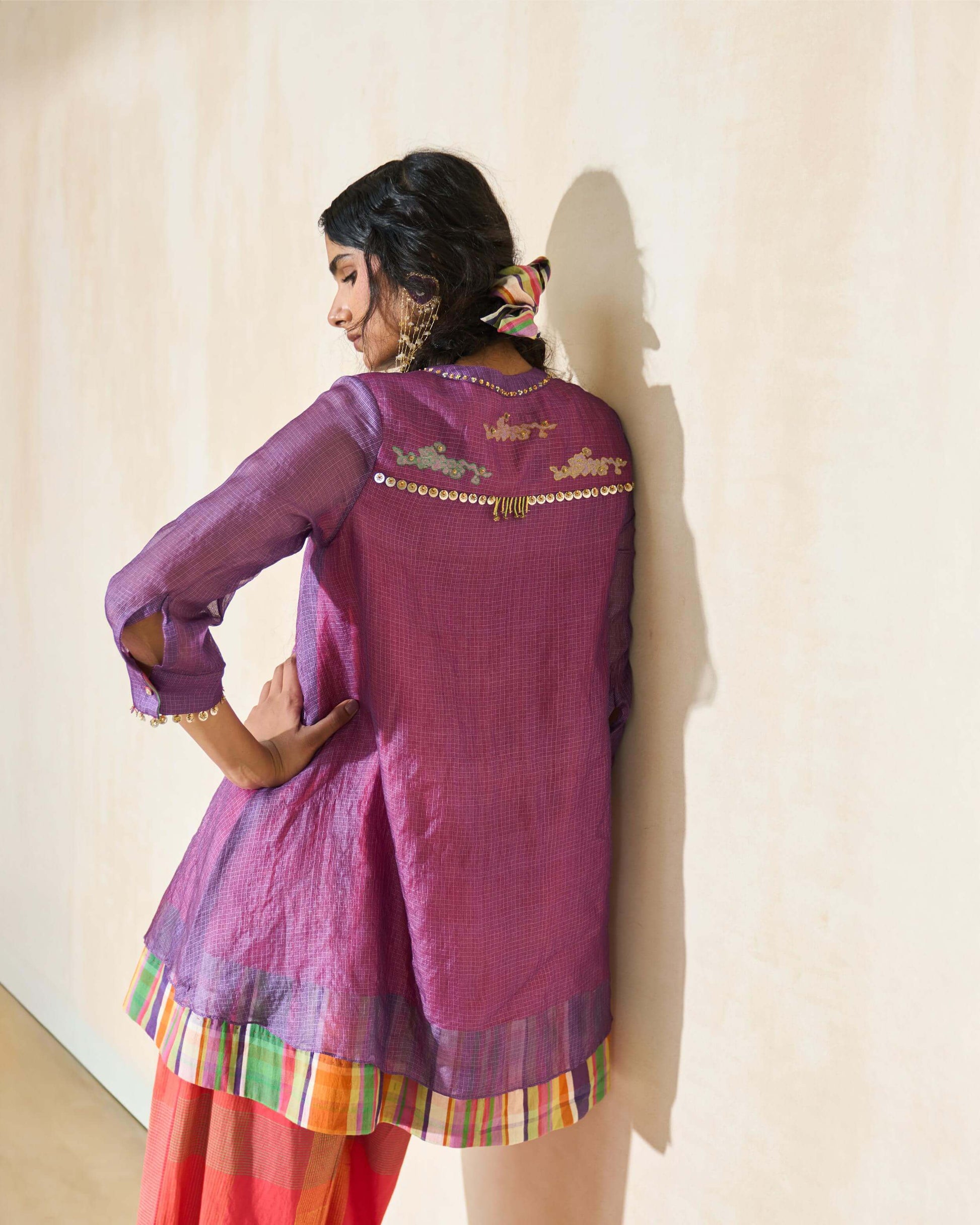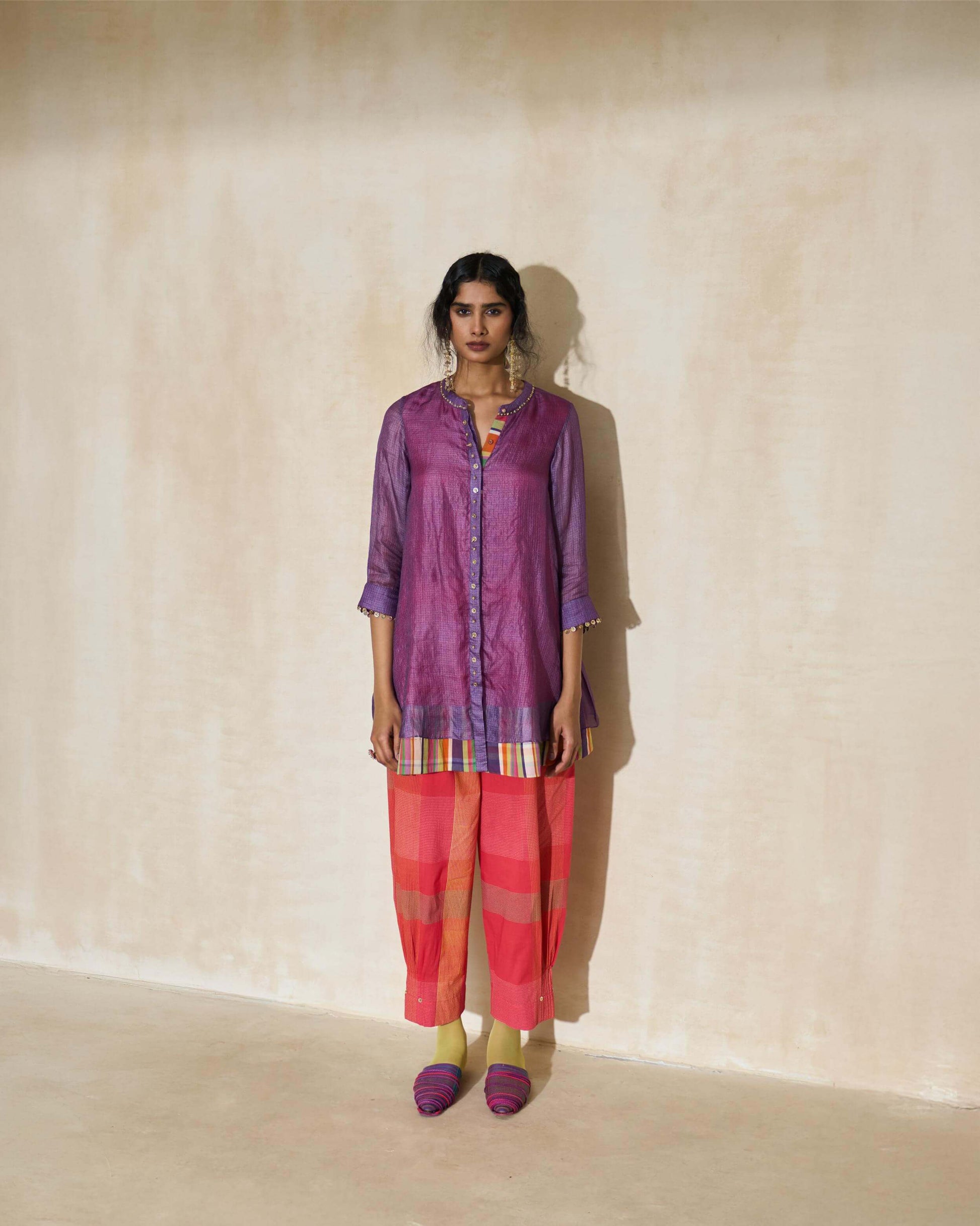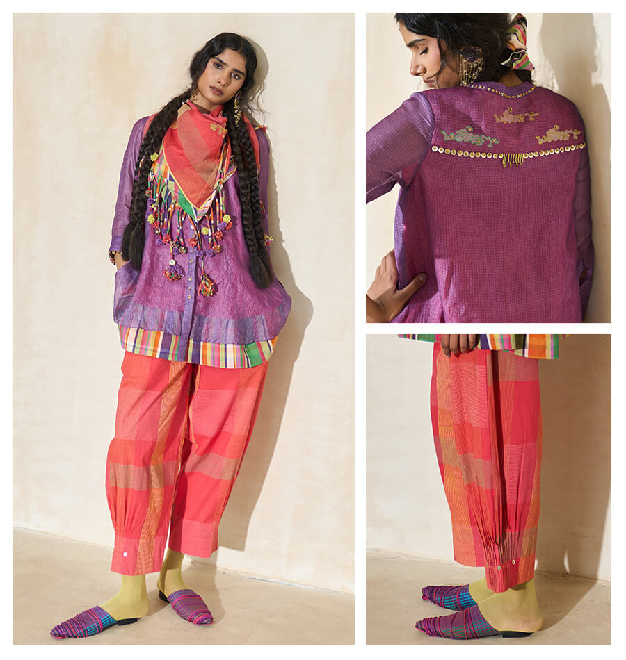 Front-open tunic in handwoven Kota silk with a 100% cotton inner layer, finished with a multicolour handwoven check border, hand-done beadwork, and a printed back yoke.
