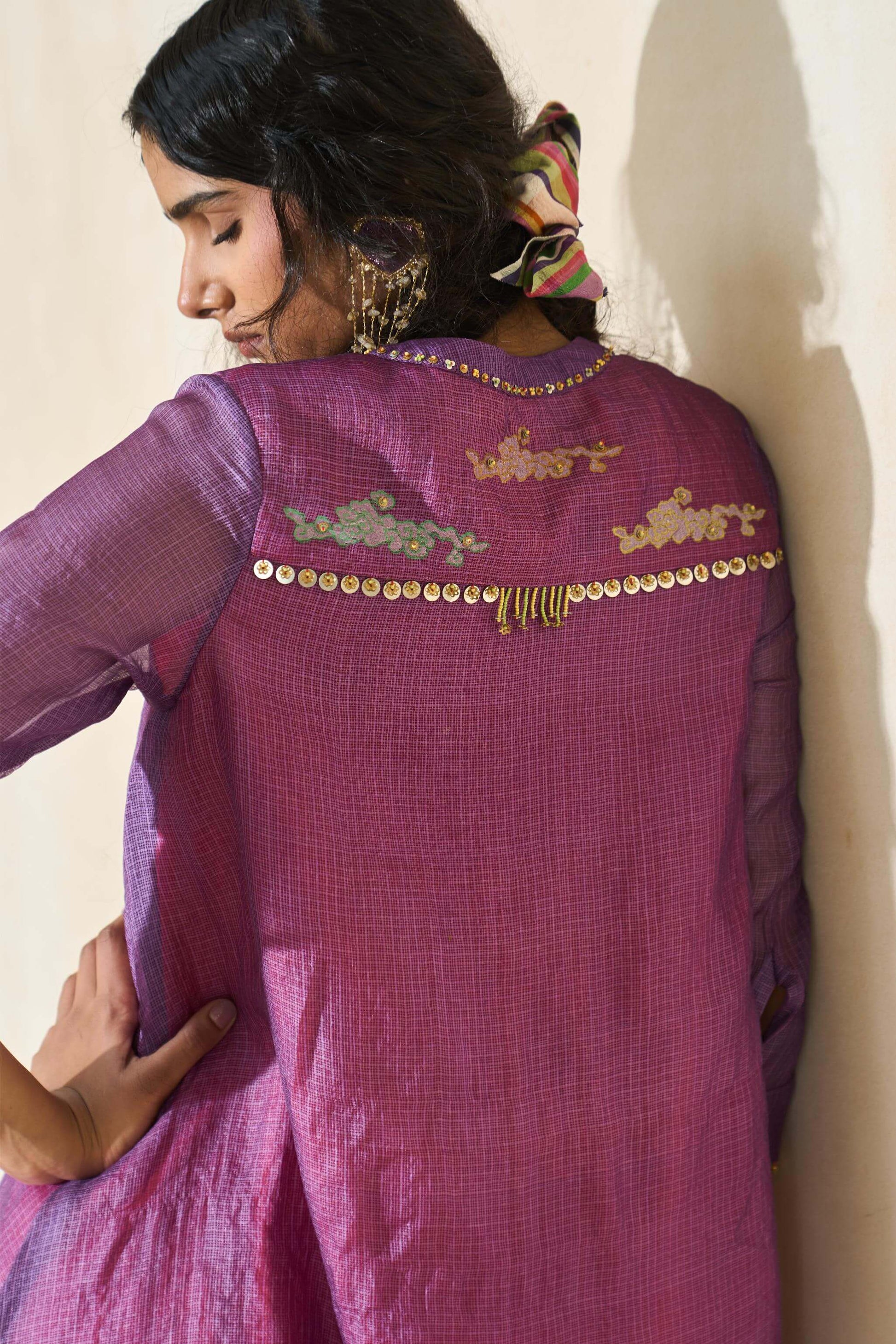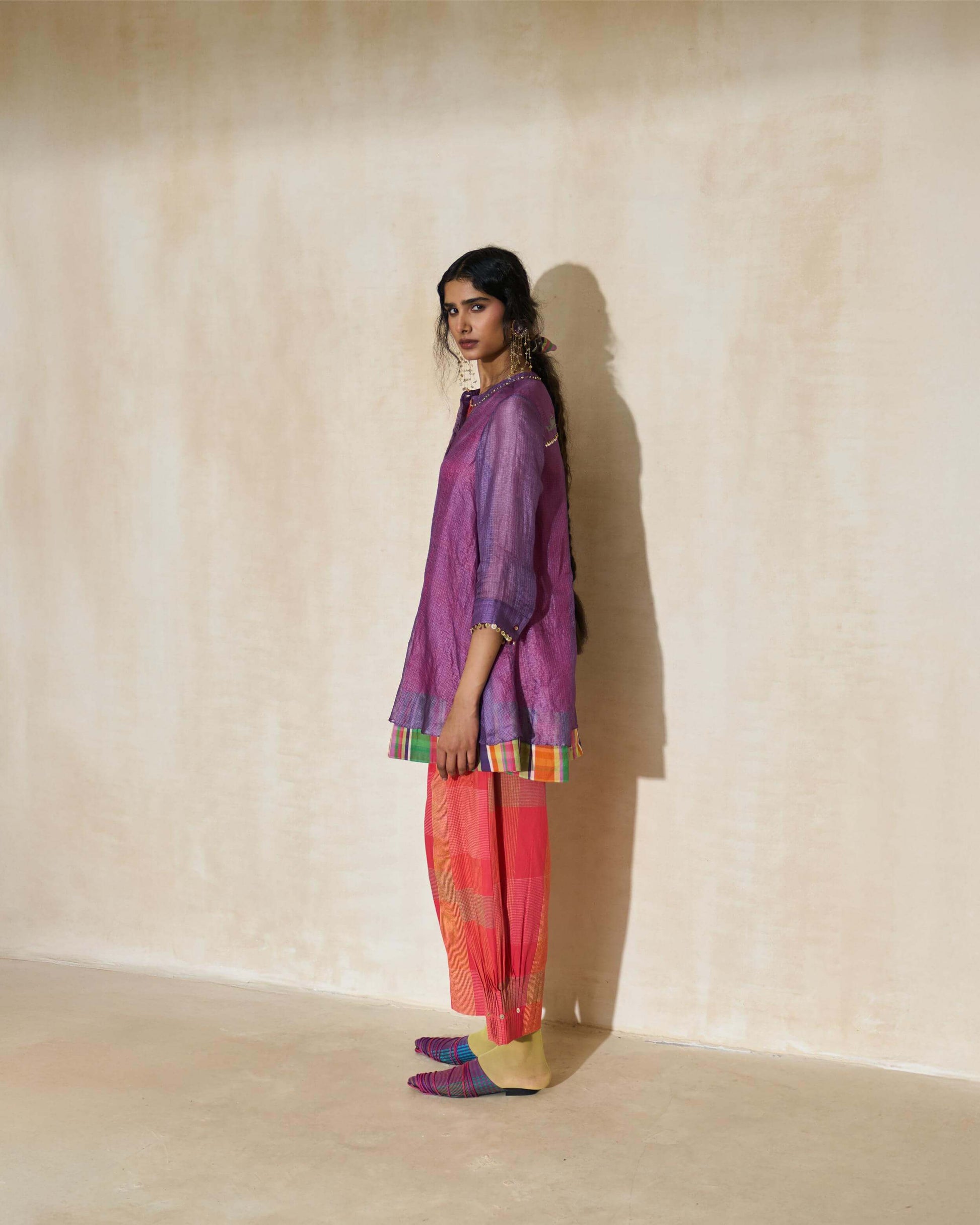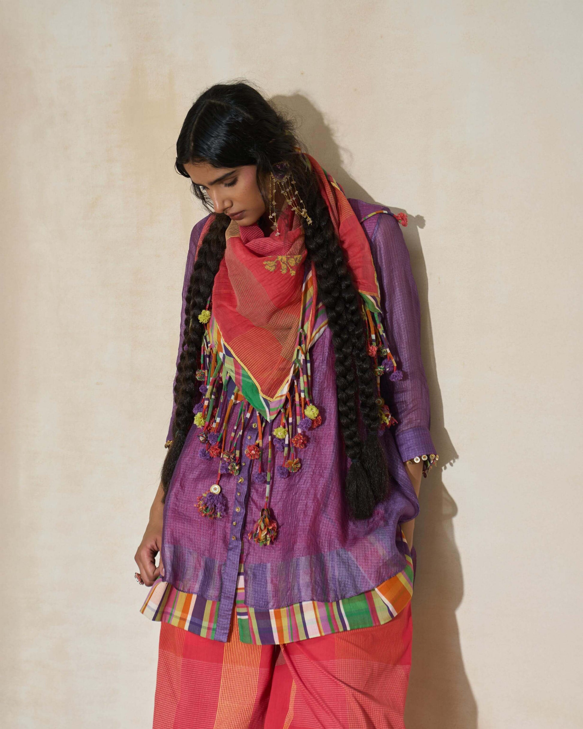 Front-open tunic in handwoven Kota silk with a 100% cotton inner layer, finished with a multicolour handwoven check border, hand-done beadwork, and a printed back yoke.