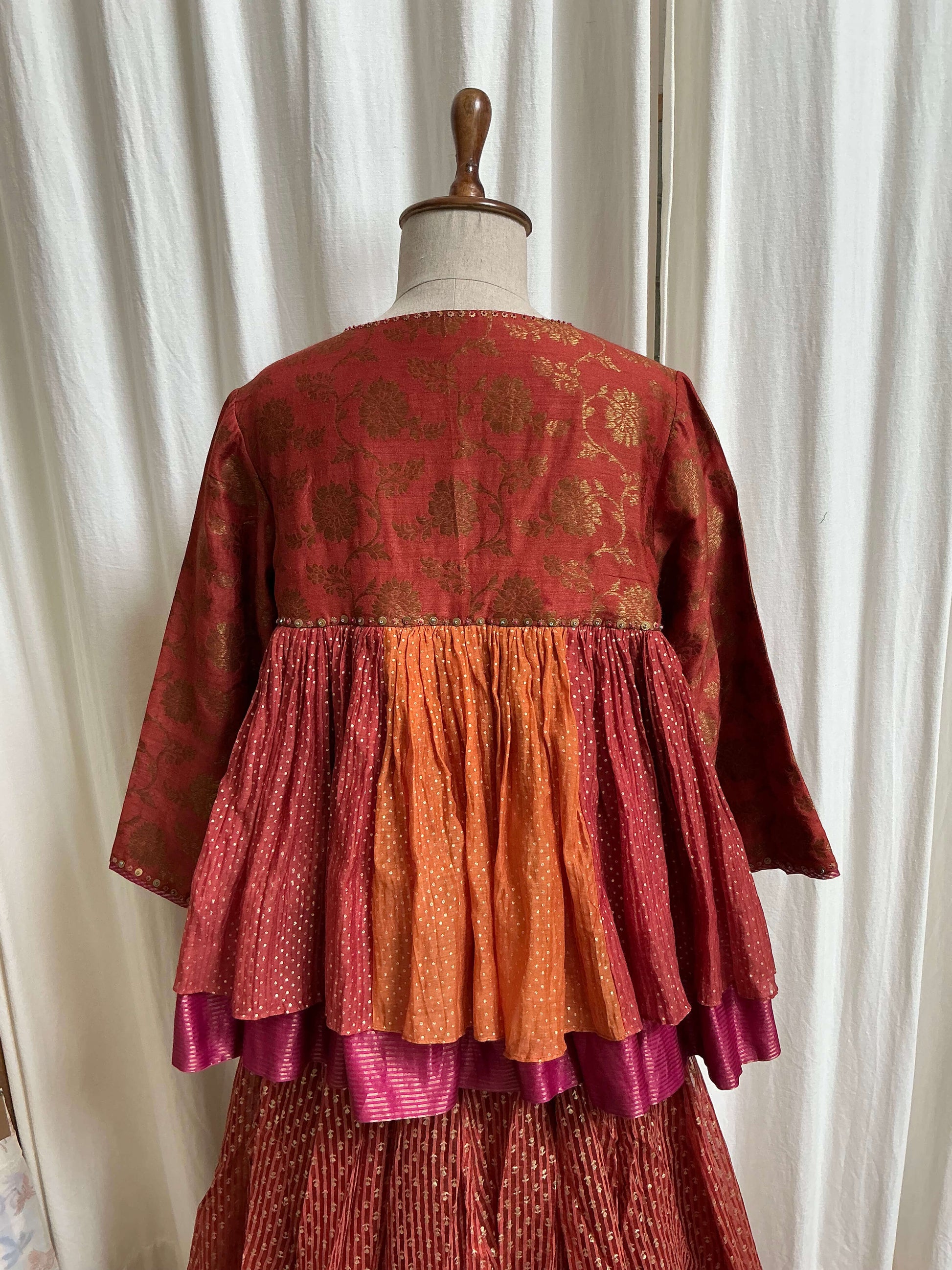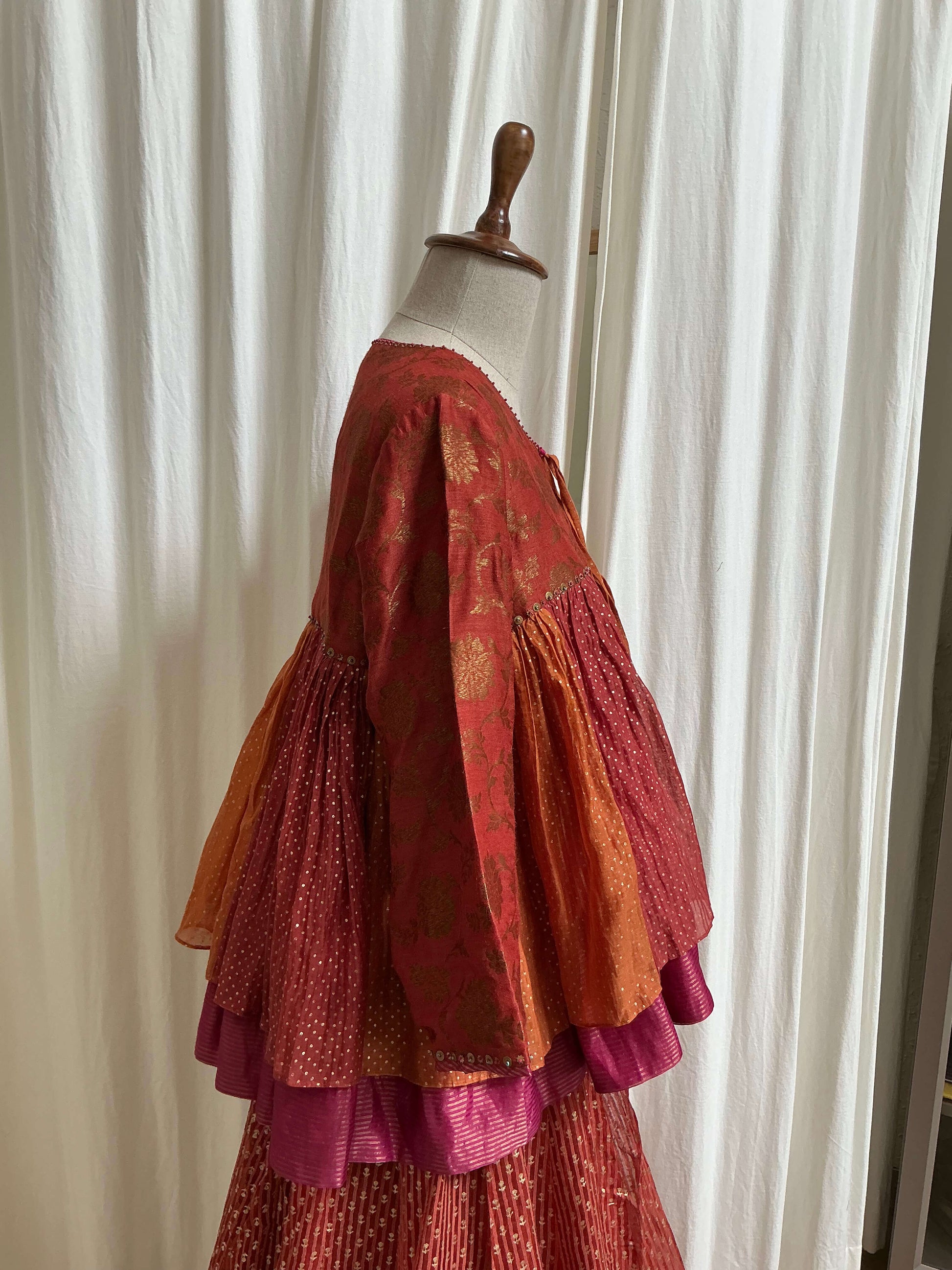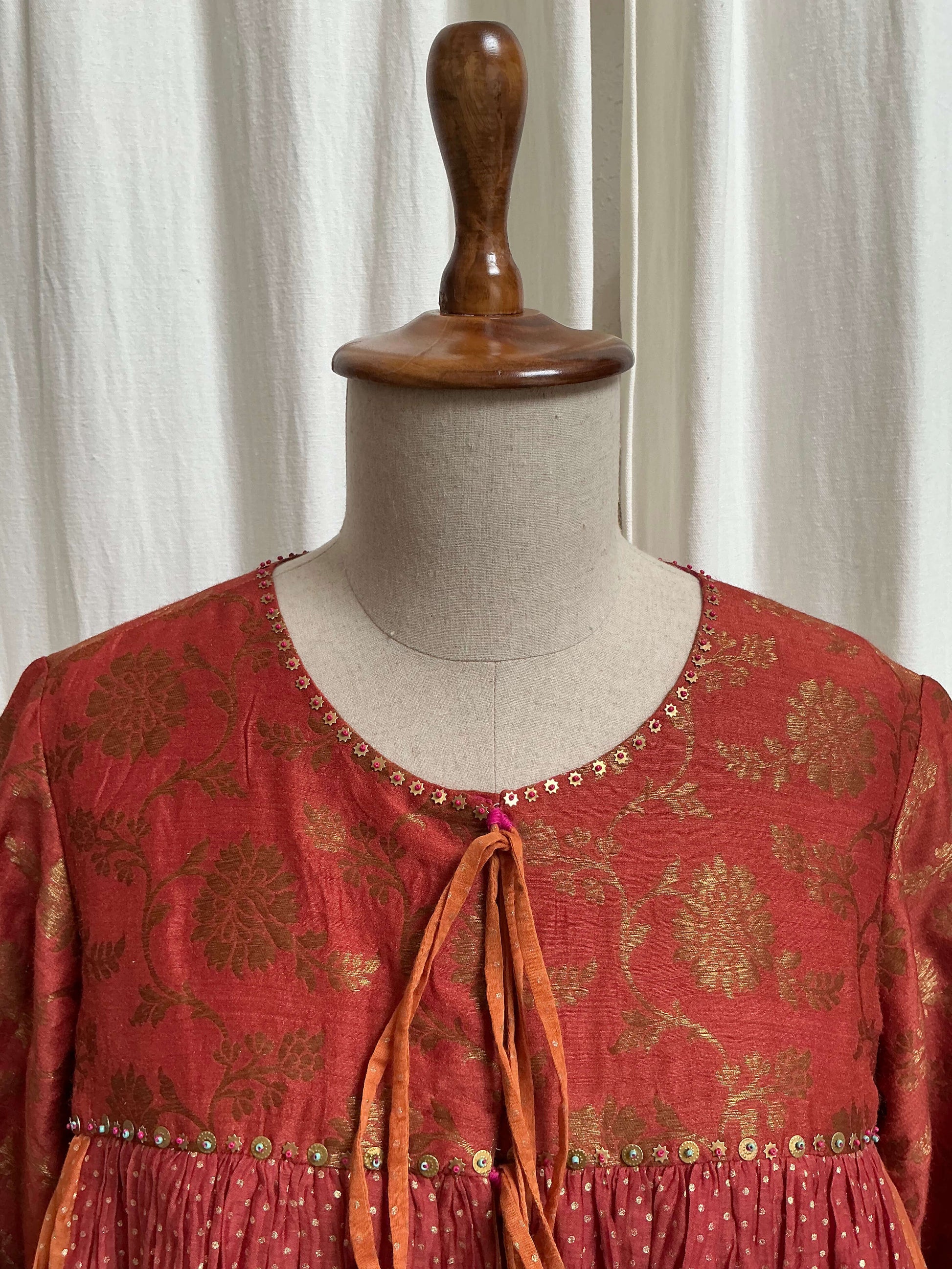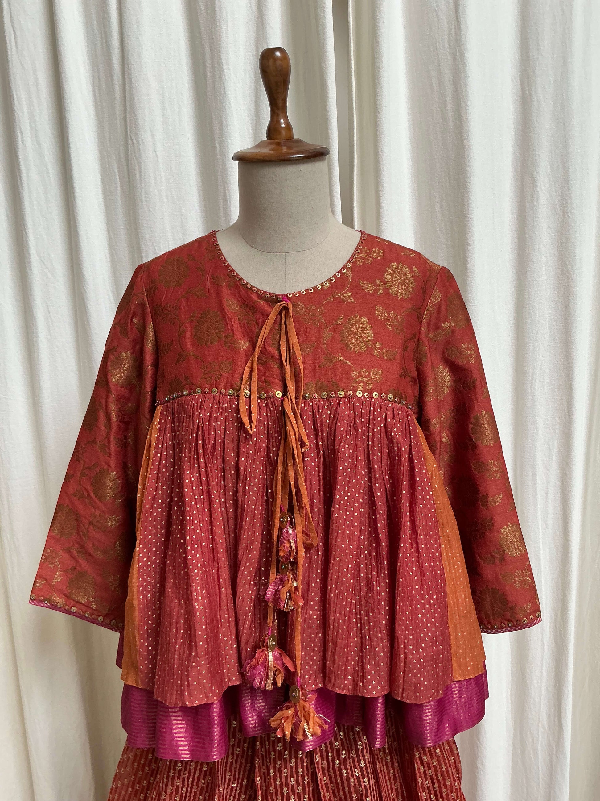 Handwoven Muga Silk Brocade Antique, Hand Woven 40gm Chanderi & Handwoven Chanderi Zari Stripe Lined With 100% Cotton Kedia Top, This Piece Is Enhanced With Gold Foil Hand Block Printing, Delicate Beaded Embellishments, And Tassels Made From Upcycled Katran Fabric.