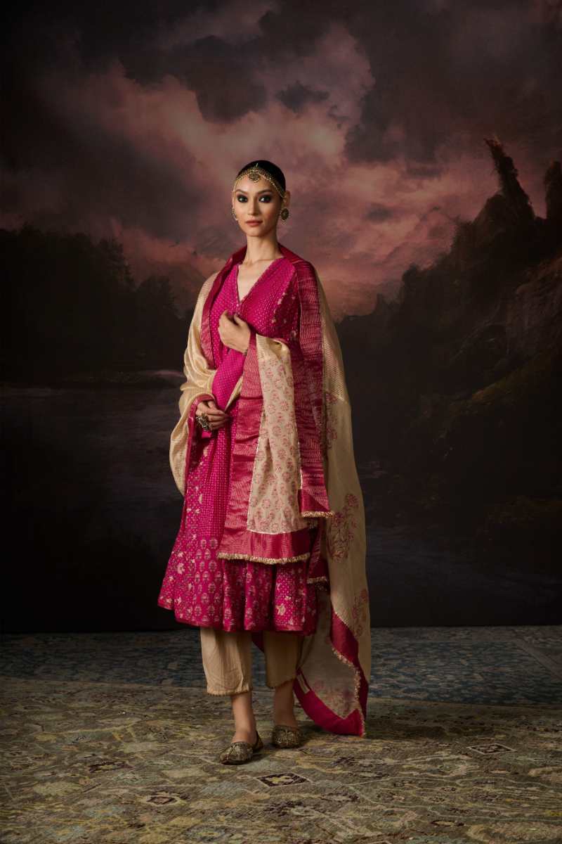 Handwoven 40gm Chanderi Pintuck Kurta with Hand Block Printing and Intricately Done Beadwork, Enhanced with Gota Detailing. Comes with a 100% Cotton Slip.